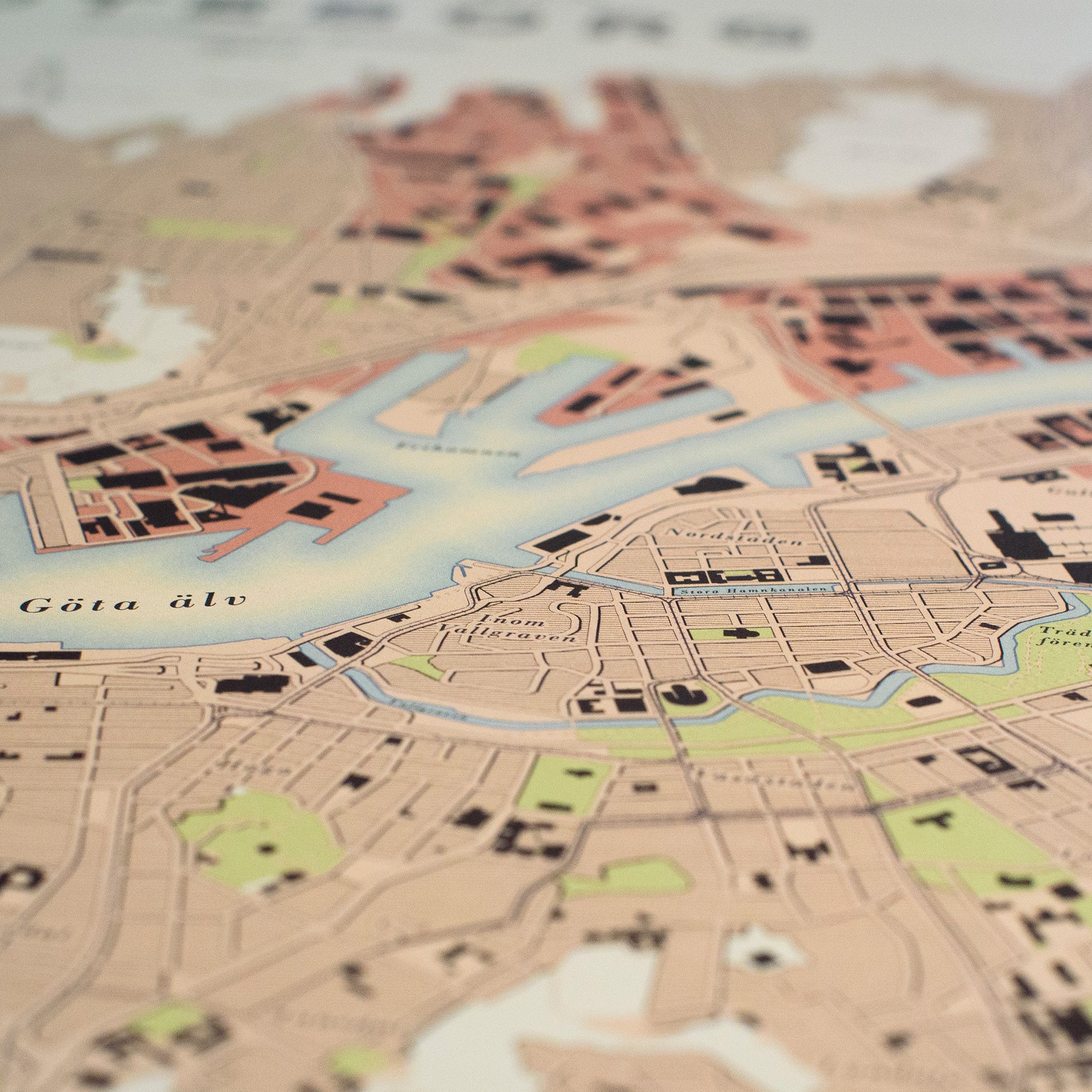 Denna unika karta över dagens Göteborg är skapad digitalt i en elegant visuell stil inspirerad av Gustaf Ljunggren stadskartor från 1860-talet. Denna affisch/poster kan pryda vilken vägg som helst!