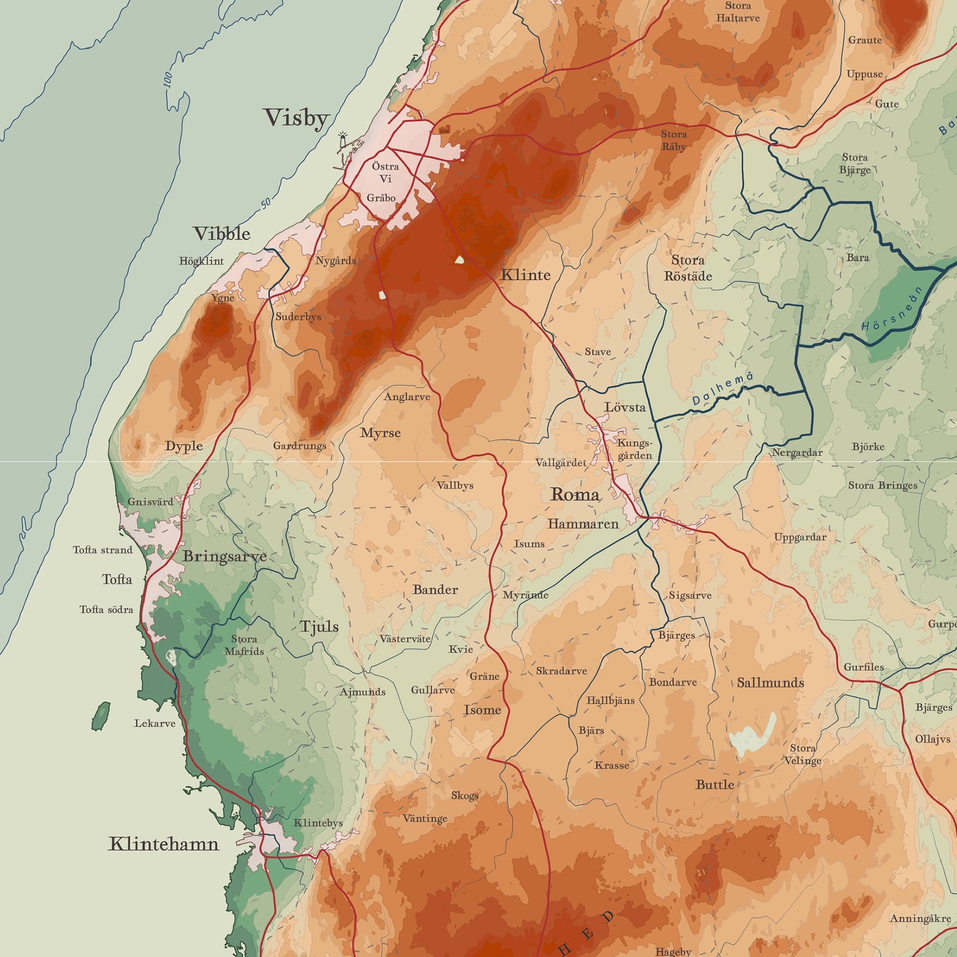Ge ditt hem en unik och tidlös känsla med denna vackra poster föreställande Gotland i vintage-stil. Kartan kombinerar klassisk kartestetik med modern tryckkvalitet – perfekt för dig som älskar Gotland, historia eller stilren inredning.